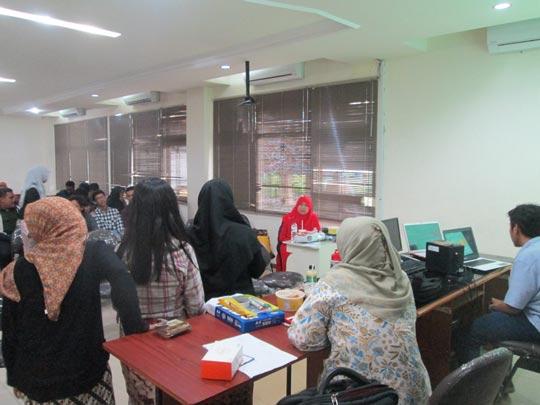 Kumpulan mahasiswa ITS duduk di depan serambi timur Masjid Manarul Ilmi, Senin (7/11). Sebuah ceramah yang bertajuk Untukmu, Separuh Agamaku yang dibawakan oleh Ustadz Gemma Ilhami mampu memberikan pengetahuan