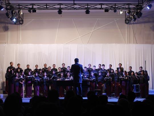 Lantunan Paduan Suara Mahasiswa (PSM) Institut Teknologi Sepuluh Nopember (ITS) menggema di aula Suara Surabaya Centre, Sabtu (29/10). Tampak hadir, musisi ternama seperti Andriano Alvin, Vinna Kurniawati, Michael Adi