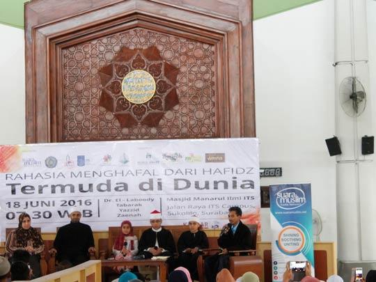 Sabtu (18/6), Masjid Manarul Ilmi Institut Teknologi Sepuluh Nopember (ITS) tampak padat akan orang yang berebut masuk. Kondisi ini terjadi karena ITS kedatangan keluarga hafidz termuda di dunia. Mereka hadir guna berbagi