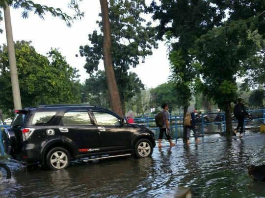 Beberapa remaja terlihat melipat tinggi celana dan melepas sepatu mereka di depan Asrama Mahasiswa ITS pada Selasa pagi (31/5). Meskipun hujan deras menyebabkan Kampus ITS tergenang banjir setinggi 10