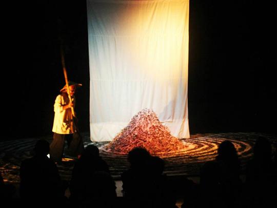 Suasana remang selimuti Plaza Dr. Angka ITS, Sabtu (12/3). Tabuh genderang dan pekik para pelaku panggung ramai terdengar. Sempat vakum lima tahun, tak membuat Teater Ragil Surabaya berhenti berkarya.