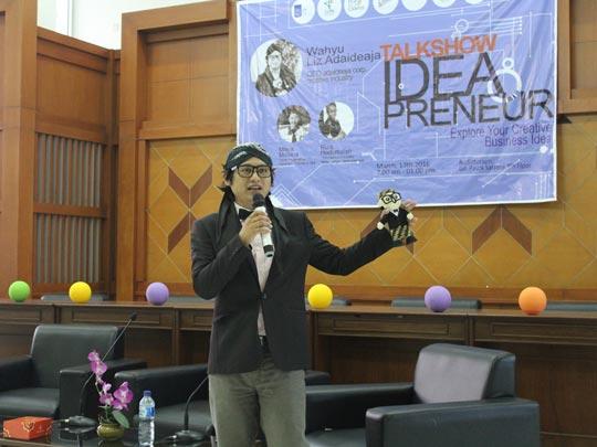 "Baru kali ini saya berada di panggung yang letaknya di bawah penonton," celetuk pria berpenampilan nyentrik tersebut yang diikuti oleh gelak tawa peserta Talkshow Ideapreneur di Auditorium Gedung Pascasarjana,
