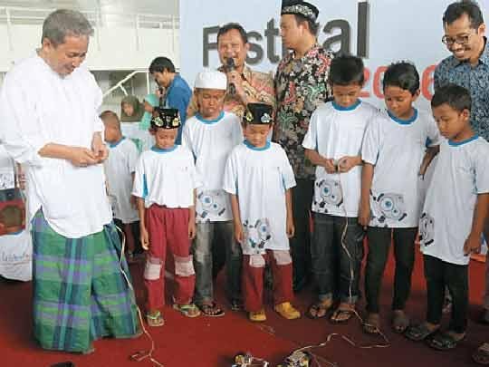 Rabu (9/3) lalu, Rektor ITS, Ir Joni Hermana M Sc ES PhD ikut memeriahkan perayaan peringatan hari ulang tahun Yatim Mandiri yang ke-22 dengan bermain dan merakit robot bersama