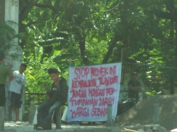 "Stop Proyek Ini, Kembalikan Jalan Kami, Jangan Nunggu Pertumpahan Darah Warga Gebang." Itulah bunyi kalimat berwarna merah yang dipasang warga Gebang di area Bundaran Institut Teknologi Sepuluh Nopember (ITS)