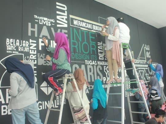 Rabu (23/12), mahasiswa Jurusan Desain Interior ITS berkreasi mendesain ruang kelasnya dengan tipografi. Kegiatan yang dinamai Interior Project (IP) itu rupanya bagian dari kegiatan pengaderan mahasiswa baru (maba) yang