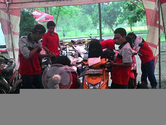 Hujan deras yang mengguyur kawasan ITS ternyata tidak menyurutkan antusiasme pengunjung Servis Gratis Jurusan D3 Teknik Mesin ITS. Hal itu tampak dari antrean motor yang mengular untuk diservis pada