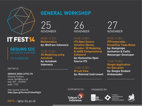 General workshop Information Technology (IT) yang merupakan rangkaian acara IT Fest di Gedung SCC lantai tiga ITS ini dipenuhi oleh kalangan mahasiswa, dosen dan laboran. Enam workshop IT yang