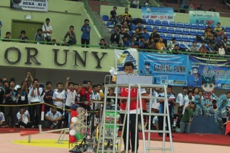 Pagelaran Kontes Robot Indonesia (KRI) 2014 telah dibuka secara resmi, Kamis (26/6). Upacara pembukaan yang berlangsung di Gelanggang Olahraga (GOR) Universitas Negeri Yogyakarta (UNY) itu diresmikan dengan pemukulan gong