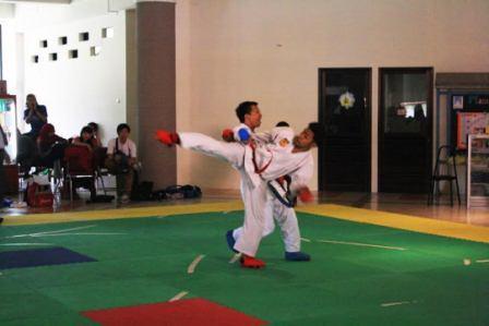 Dua pemuda sebaya memasang kuda-kuda. Mereka mengenakan seragam khas karateka, lengkap dengan pita dan atribut pengaman. Sesekali pukulan melayang ke arah kepala salah satu pemuda. Spontan, ia pun membalas