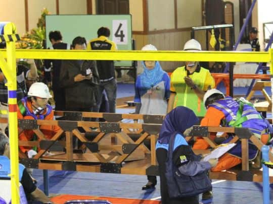 Usai uji pembebanan jembatan baja dan busur yang dilaksanakan Sabtu (30/11), Kompetisi Jembatan Indonesia (KJI) IX hari ini dilanjutkan dengan perakitan jembatan kayu sekaligus uji pembebanannya. Digawangi oleh Tim