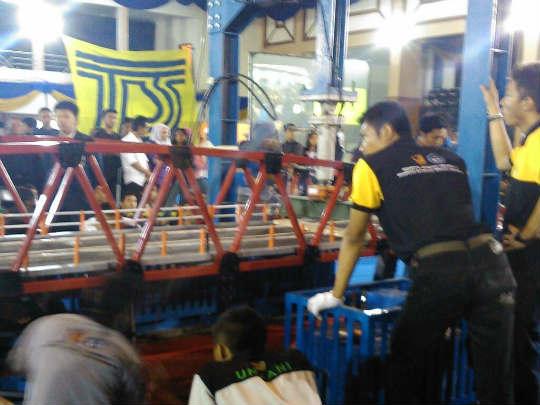 Pada uji beban, Kompetisi Jembatan Indonesia (KJI) IX kategori bentang panjang atau busur, Sabtu (30/11) tim ITS berhasil mencapai peringkat kedua. Pada poin kekokohan ini ITS hanya selisih tipis