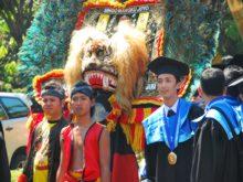 Ada saja aksi mahasiswa ITS untuk menyambut wisudawan 105. Di antara lautan arak-arakan, tampak sesosok Reog sedang berparodi bersama para wisudawan. Grup kesenian Reog ini sengaja diundang oleh mahasiswa