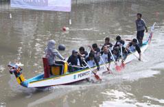 Dua buah perahu dayung terlihat saling membalap satu sama lain di sepanjang Kali Mas. Terik matahari siang itu tidak membuat 12 orang yang mendayung terlihat menyerah. Mereka justru mendayung