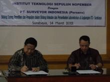 ITS menandatangani nota kesepahaman dengan PT Surveyor Indonesia, Rabu (14/3). ITS yang telah berpengalaman dalam bidang perkapalan dan kelautan diminta untuk ikut terlibat dalam membenahi standar kapal domestik di