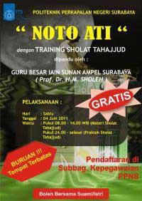 Gedung Teater Politeknik Perkapalan Negeri Surabaya (PPNS) ITS tampak dipenuhi oleh ratusan orang. Pasalnya, di ruangan tersebut diselenggarakan acara Noto Ati dengan training shalat tahajud (4/6). Guru Besar dari