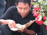 Kaos hitam bertuliskan Uber Alles besar di belakangnya itu basah kuyup. Namun pemuda yang memakai baju itu tampak bahagia. Ia menyantap nasi yang dibungkus dengan kertas coklat itu dengan