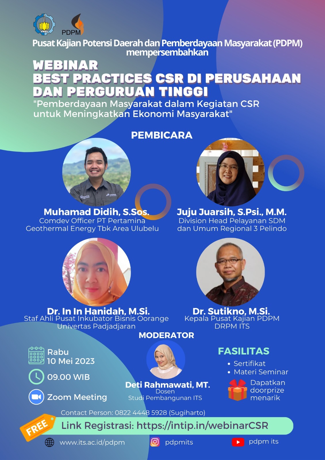 Ikuti Webinar Best Practices CSR di Perusahaan dan Perguruan Tinggi. “Pemberdayaan masyarakat dalam kegiatan CSR untuk meningkatkan ekonomi masyarakat.” Narasumber nya dari praktisi CSR di Perusahaan dan Perguruan Tinggi. 1. Muhamad Didih, S.Sos. Community Development Officer PT. Pertamina Geotermal Energi Tbk. Area Ulubelu. 2. Juju Juarsih, S.Psi., MM. Division Head Pelayanan SDM dan Umum Regional 3 PT. Pelabuhan Indonesia (Pelindo). 3. Dr. In In Hanidah, M.Si. Dosen dan Staf Ahli Inkubator Bisnis Oorange Universitas Padjajaran. 4. Dr. Sutikno, M.Si. Kepala Pusat Kajian Potensi Daerah dan Pemberdayaan Masyarakat (PDPM) ITS. Moderator: Deti Rahmawati, MT. Dosen Studi Pembangunan ITS. Webinar dilaksanakan secara daring pada Rabu 10 Mei 2023. FREE!!! Peserta akan mendapatkan sertifikat dan soft file materi. Oh ya, ada door prize nya juga lho. Yuks segera daftar di link pendaftaran. CP chat WA 0822 4448 5928 (Sugiharto) atau telpon 031-5962271.