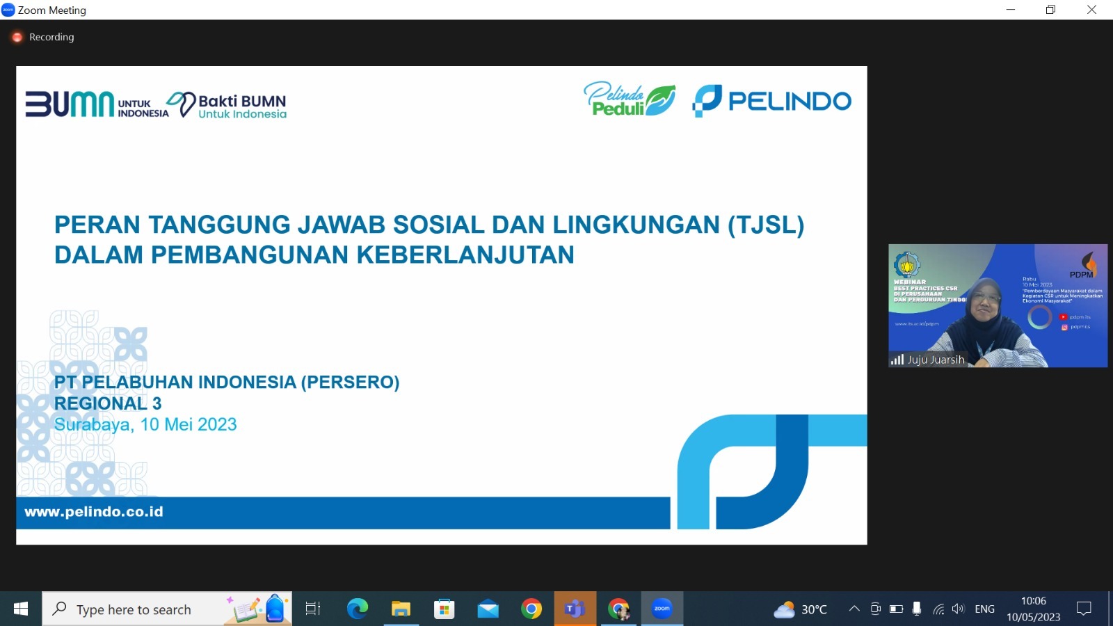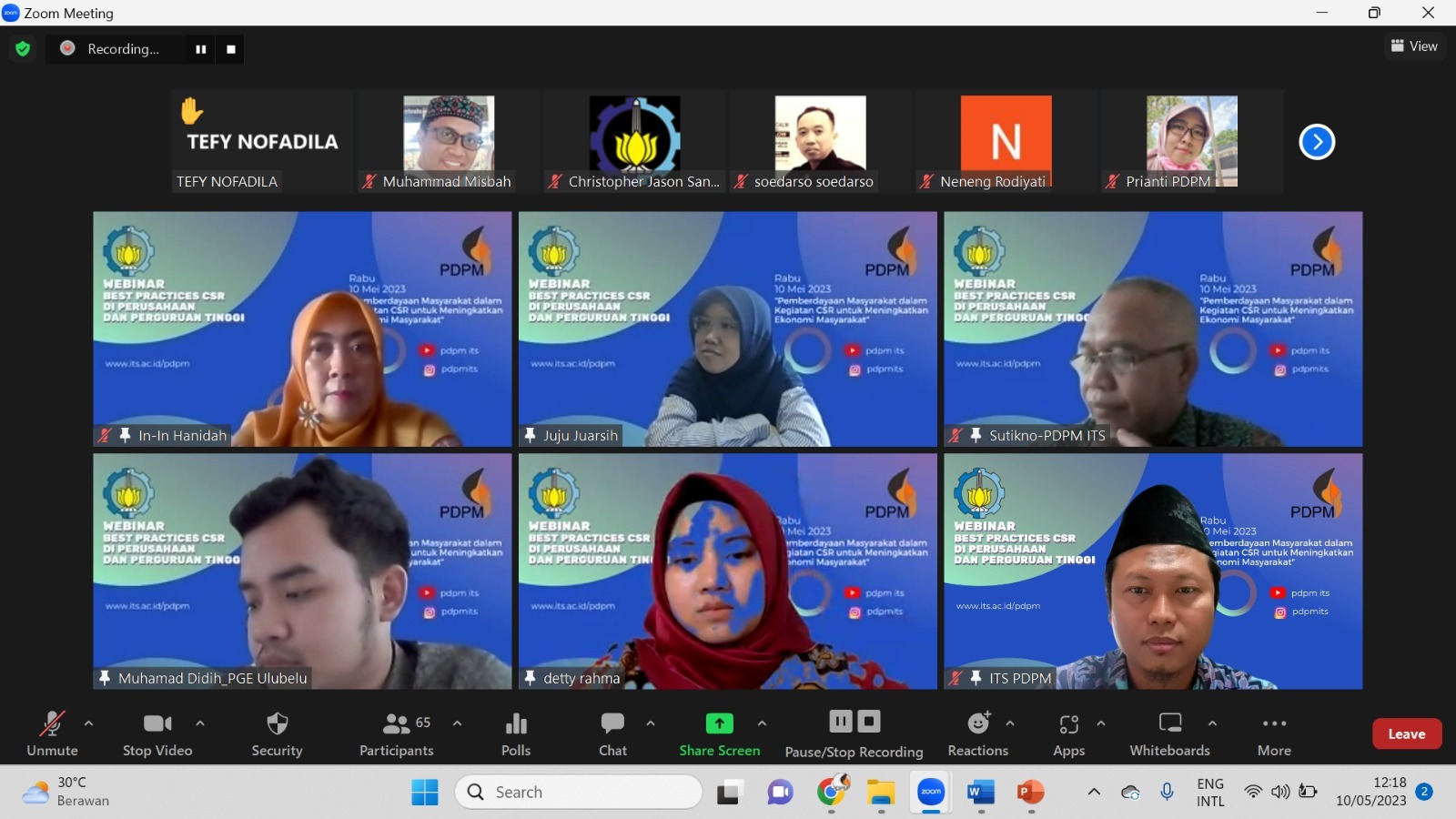 Rabu, 10 Mei 2023, PDPM ITS menyelenggarakan webinar Best Practices CSR di Perusahaan dan Perguruan Tinggi melalui zoom meeting. Narasumber webinar adalah praktisi CSR di Perusahaan dan Perguruan Tinggi, yaitu Muhamad Didih, S.Sos selaku Community Development Officer PT. Pertamina Geotermal Energi Tbk. Area Ulubelu,, Juju Juarsih, S.Psi., MM sebagai Division Head Pelayanan SDM dan Umum Regional 3 PT. Pelabuhan Indonesia (Pelindo), Dr. In In Hanidah, M.Si sebagai dosen dan staf ahli inkubator Bisnis Oorange Universitas Padjajaran, Dr. Sutikno, M.Si selaku kepala Pusat Kajian Potensi Daerah dan Pemberdayaan Masyarakat (PDPM) ITS. Webinar berlangsung selama 4 jam diikuti oleh 92 peserta baik dari kalangan industri, maupun mahasiswa.