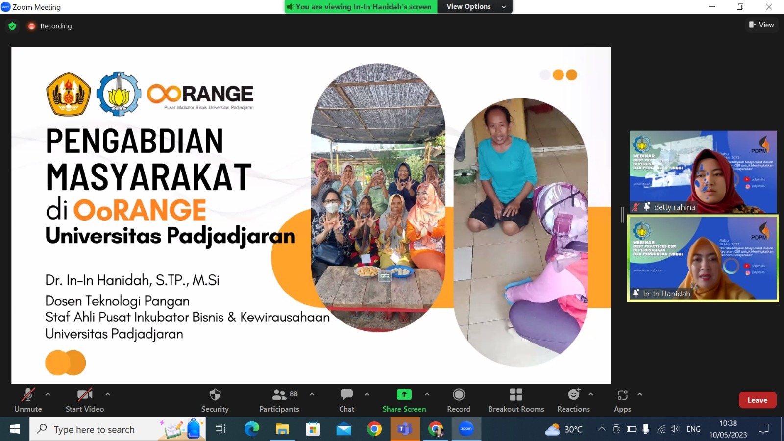 Materi selanjutnya disampaikan oleh Dr. In In Hanidah, M.Si. OOrange adalah pusat inkubator bisnis di Universitas Padjajaran. Permasalahan UMKM saat ini adalah kebiasaan dan pola pikir (tidak berani bermimpi, zona nyaman, daya juang rendah), sumber daya manusianya kurang pengetahuan dan ketrampilan, produk tidak memiliki value atau belum berbasis kebutuhan konsumen, perlu revisi konsep produk dan analis produk competitor, pemasaran terbatas dan lemah jejaring. Pola pendampingan pengabdian pada masyarakat di OOrange adalah validasi data, analisis konsep produk, penguatan SDM KPM, legalitas dan penguatan, mentoring dan evaluasi serta Expo.