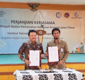 Surabaya-ITS. Senin 29 Mei 2023 Institut Teknologi Sepuluh Nopember (ITS) Surabaya dengan Kantor Wilayah Badan Pertanahan Nasional (BPN) Provinsi Jawa Timur melaksanakan tanda tangan Perjanjian Kerja Sama Kegiatan Kajian Kerentanan Sosial Provinsi Jawa Timur Program Percepatan Reforma Agraria (PPRA). Kegiatan ini dilaksanakan di Aula Reforma Agraria Lantai 2 Kanwil BPN Jawa Timur. Hadir dalam kegiatan ini adalah Kepala Kantor Wilayah BPN Jawa Timur Ir. H. Jonahar, M.Ec.Dev., Kepala Bagian Tata Usaha Ribut Cahyono, SH., MHum., Kepala Bidang Survei dan Pemetaan BPN Jawa Timur Hendi Pranabowo, ST., Kepala Kantor Pertanahan lokasi kajian dan Project Manajemen Unit (PMU) Bank Dunia, Direktur Riset dan Pengabdian kepada Masyarakat ITS Fadlilatul Taufany, ST., Ph.D., tenaga ahli Kajian Kerentanan Sosial Dr Soedarso, M.Hum. dan Yuni Setyaningsih, S.PKm., M.Sc. dari Departemen Studi Pembangunan ITS.