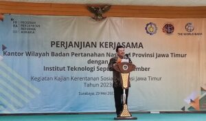 Kepala Kantor Wilayah BPN Jawa Timur Ir. H. Jonahar, M.Ec.Dev. menyampaikan bahwa kerja sama dengan ITS sudah ada sejak Tahun 2022. Melalui program strategi nasional percepatan PTSL. Indikator kinerja Kementerian Agraria dan Tata Ruang (ATR)/ Badan Pertanahan Nasional (BPN) 25% berasal dari Kanwil BPN Jawa Timur. Jadi kalau kinerja Kanwil BPN Jawa Timur kurang bagus, bisa dipastikan Kinerja Kementerian ATR/BPN pasti juga kurang bagus. Maka Kanwil BPN Jawa Timur harus bekerja secara tepat waktu dan tepat target. Seperti PKS Kajian Kerentanan Sosial PPRA ini harus tepat waktu dan tepat target.