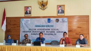 Trenggalek-ITS. Direktorat Riset dan Pengabdian kepada Masyarakat (DRPM) Institut Teknologi Sepuluh Nopember (ITS) Surabaya menyelenggarakan kegiatan Focus Group Discussion (FGD) Kajian Kerentanan Sosial (KKS) Program Percepatan Reforma Agraria (PPRA) Kabupaten Trenggalek. FGD KKS dilaksanakan pada hari Senin 17 Juli 2023 di Satker Kantor Pertanahan (Kantah) Kabupaten Trenggalek. Kegiatan ini dihadiri oleh perwakilan Kantor Wilayah BPN Provinsi Jawa Timur, perwakilan Kantah Kabupaten Trenggalek, Tim Project Manajemen Unit (PMU) Program Percepatan Reforma Agraria (PPRA) Triatmoko SP, Tim Kajian Kerentanan Sosial ITS Jawa Timur, Perhutani KPH Trenggalek, Kepala Desa Petung Kecamatan Dongko, Kepala Desa Ngrandu Kecamatan Suruh, pihak pengukur PTSL PM PT Geomosaik Indonesia, puldatan dan asisten tim KKS Jawa Timur.