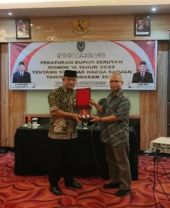 Palangkaraya-ITS. Kamis 21 Desember 2023, Pusat Kajian Potensi Daerah dan Pemberdayaan Masyarakat (PDPM) Institut Teknologi Sepuluh Nopember (ITS) Surabaya bersama Badan Keuangan dan Aset Daerah (BKAD) Kabupaten Seruyan melaksanakan sosialisasi Peraturan Bupati (Perbup) Seruyan No. 16 Tahun 2023 tentang Standar Harga Satuan Tahun 2024. Kegiatan sosialisasi ini dilaksanakan di Kota Palangkaraya Provinsi Kalimantan Tengah. Sosialisasi ini dihadiri oleh perwakilan organisasi perangkat daerah (OPD) yang ada di Kabupaten Seruyan. Turut hadir dalam kegiatan ini adalah Kepala PDPM ITS Dr. Sutikno dan Ketua Tim Penyusun HSPK dan ASB Tahun 2024 Cahyono Bintang Nurcahyo, ST., MT.