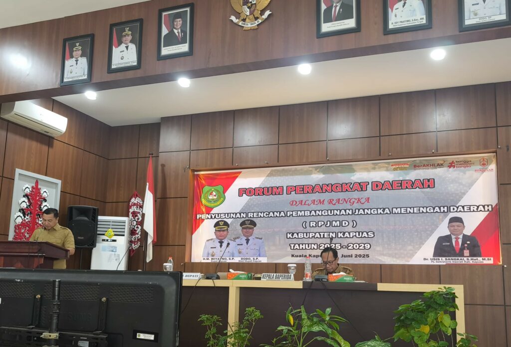 Pemerintah Daerah Kabupaten Kapuas melaksanakan Forum Perangkat Daerah dalam rangka Penyusunan Rencana Pembangunan Jangka Menengah Daerah (RPJMD) Kabupaten Kapuas Tahun 2025-2029, bertempat di Aula Bapperida Kapuas, Senin (16/6). Kegiatan ini dibuka Wakil Bupati Kapuas Dodo didampingi Kepala Bapperida Kapuas M. Saribi dan dihadiri Staf Ahli Bupati Bidang Ekonomi, Keuangan dan Pembangunan, Septedy, Kepala Perangkat Daerah Lingkup Pemkab Kapuas, Camat se Kabupaten Kapuas dan Tim Pendamping dari Institut Teknologi Sepuluh Nopember (ITS) Surabaya.