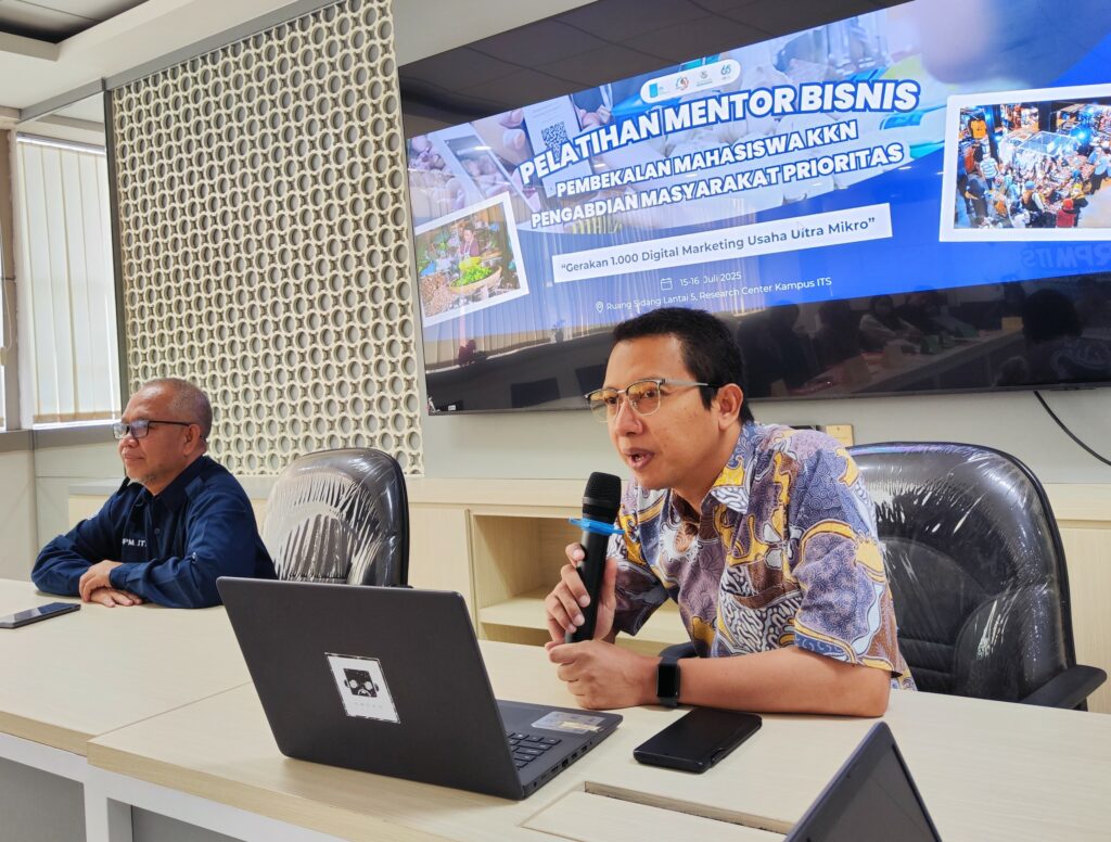 Institut Teknologi Sepuluh Nopember (ITS) Surabaya melalui Direktorat Riset dan Pengabdian kepada Masyarakat (DRPM) resmi membuka Pelatihan Mentor Bisnis-Pembekalan Mahasiswa KKN Pengabdian Masyarakat (Abmas) Gerakan 1.000 Digital Marketing Usaha Ultra Mikro (UMi). Kegiatan ini dilaksanakan selama 2 (dua) hari, 15-16 Juli 2025 di Ruang Sidang DRPM Gedung Research Center Lantai 5. Pembekalan mahasiswa KKN ini diikuti oleh mahasiswa yang telah mandaftar dan terpilih menjadi peserta KKN Digital Marketing. Pelatihan mentor bisnis-Pembekalan mahasiswa KKN Digital Marketing dibuka oleh Kasubdit Pengabdian kepada Masyarakat DRPM, Prof. Dr. Nurul Jadid, S.Si., M.Sc. Nurul Jadid menyampaikan apresisasi dan terima kasih kepada mahasiswa yang telah bersedia mengikuti Abmas Digital Marketing. Saat ini adalah libur kuliah, tapi kalian bersedia hadir dan mengikuti pelatihan dan pembekalan KKN ini. Ini adalah sebuah pengabdian yang luar biasa. Mahasiswa KKN Digital Marketing akan mendampingi pelaku usaha ultra mikro (UMi) dalam pemasaran digital. Kalian membawa nama ITS ketika sudah di lapangan. Jaga nama baik ITS selama kegiatan mendampingi UMi. Lokasi KKN Digital Marketing di Kota Surabaya, Kabupaten Sidoarjo, dan Kabupaten Gresik. Mahasiswa KKN adalah ujung tombak pendampingan pelaku usaha ultra mikro (UMi). Pelatihan ini dilaksanakan untuk membekali mahasiswa dengan keterampilan praktis sebagai mentor bisnis agar mampu mendampingi UMi dalam aspek menentukan keunggulan produknya, mampu menghitung HPP, mampu menentukan harga jual yang kompetitif, mampu membuat foto, video, dan brosur promosi produk, serta mampu mendampingi UMi dalam memanfaatkan media digital untuk pemasaran produknya. Abmas Digital Marketing ini melibatkan 25 dosen pendamping dan 40 mahasiswa dari berbagai Departemen/Fakultas di ITS.