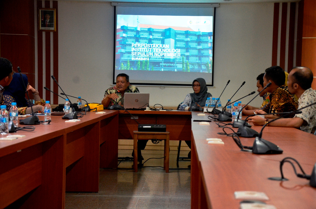 The group was welcomed in the 2nd-floor Bibliotek room which is a court/meeting room owned by the ITS library. The event began with remarks and introductions from each party, then remarks from the Head of PIP Semarang Library, Alfi Maryati who conveyed the purpose of this comparative study, which was to find out various things about E-Journal Management which included: management, uploading manuscript management up to published (publications), e-journal guidelines, editorial policies, team editors and reviewers and authors’ copyrights. Besides that, he also wants to know about Library Management which includes: management, library development, library material processing (automation and repositories), user services, information literacy and HR development.
