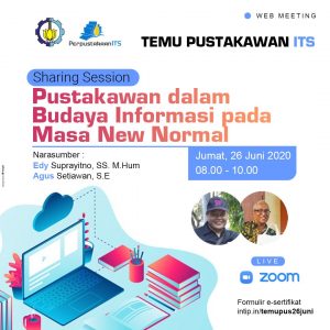 The event which was held on Friday (6/26/2020) presented speakers from among the librarians themselves, namely two speakers, the first being Edy Suprayitno and Agus Setiawan. They are senior librarians who are Associate Librarians in the ITS Library. His presentation was about Library Preparation and librarians in facing the New Normal era related to the implementation of WFO (Work From Office) which will take effect this July.