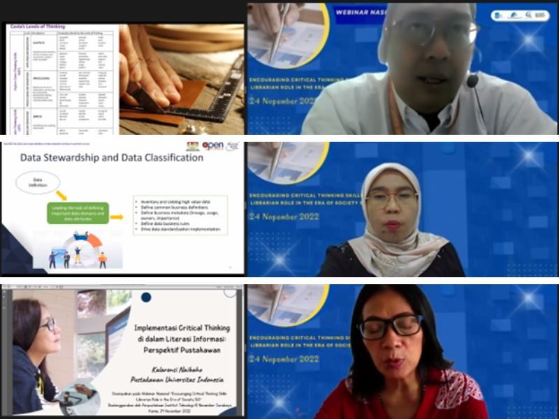 The highlight of the webinar activity at the ITS library is 2022 ITS Library National Webinar, this time with the theme “Encouraging Critical Thinking Skills: Librarian Role in the Era of Society 5.0”. The aims and objectives of this webinar are to provide participants with an overview of what critical thinking skills are, why these skills are needed, and how librarians develop critical thinking skills.