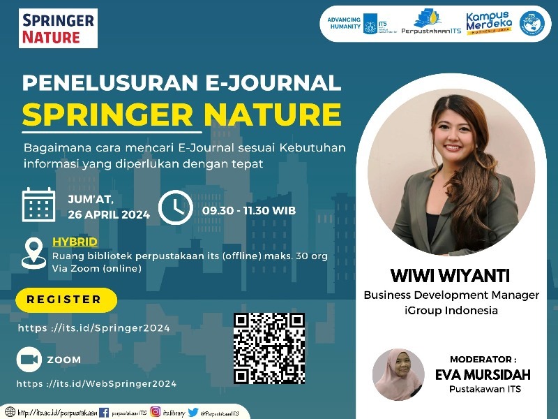 📆 Friday, April 26, 2024 ⏰09.30-11.30 WIB Hybrid Training (online dan offline) – Media Zoom Meeting (Online) – Bibliotek Room 2nd Floor ITS Library (Offline)
