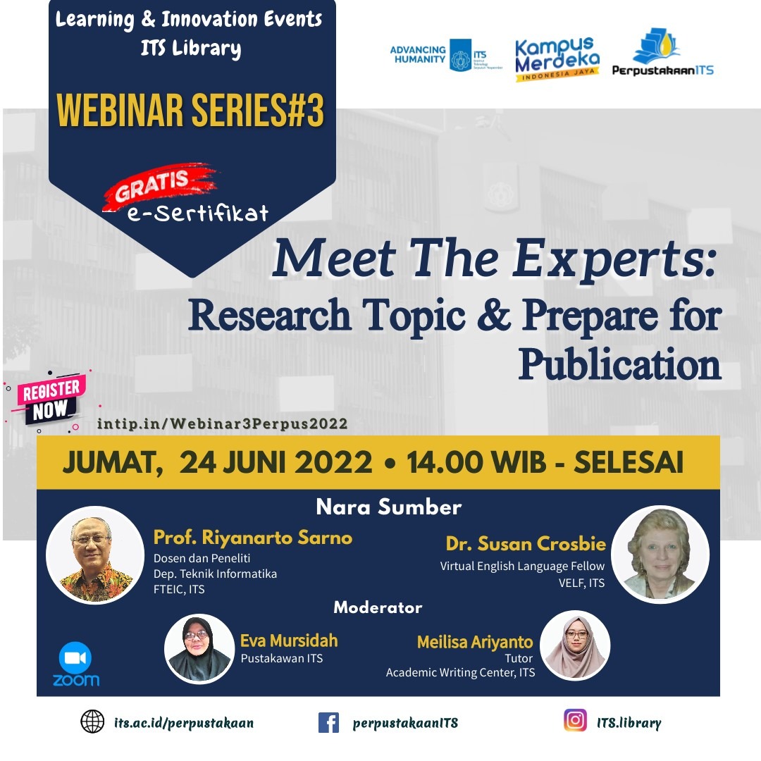 Untuk menemukan jawabannya, ikuti webinar series#3 yang diselenggarakaan Perpustakaan ITS bersama Academic Writing Center (AWC) ITS dengan tema “Meet the Experts: Research Topic and Prepare for Publication” pada: