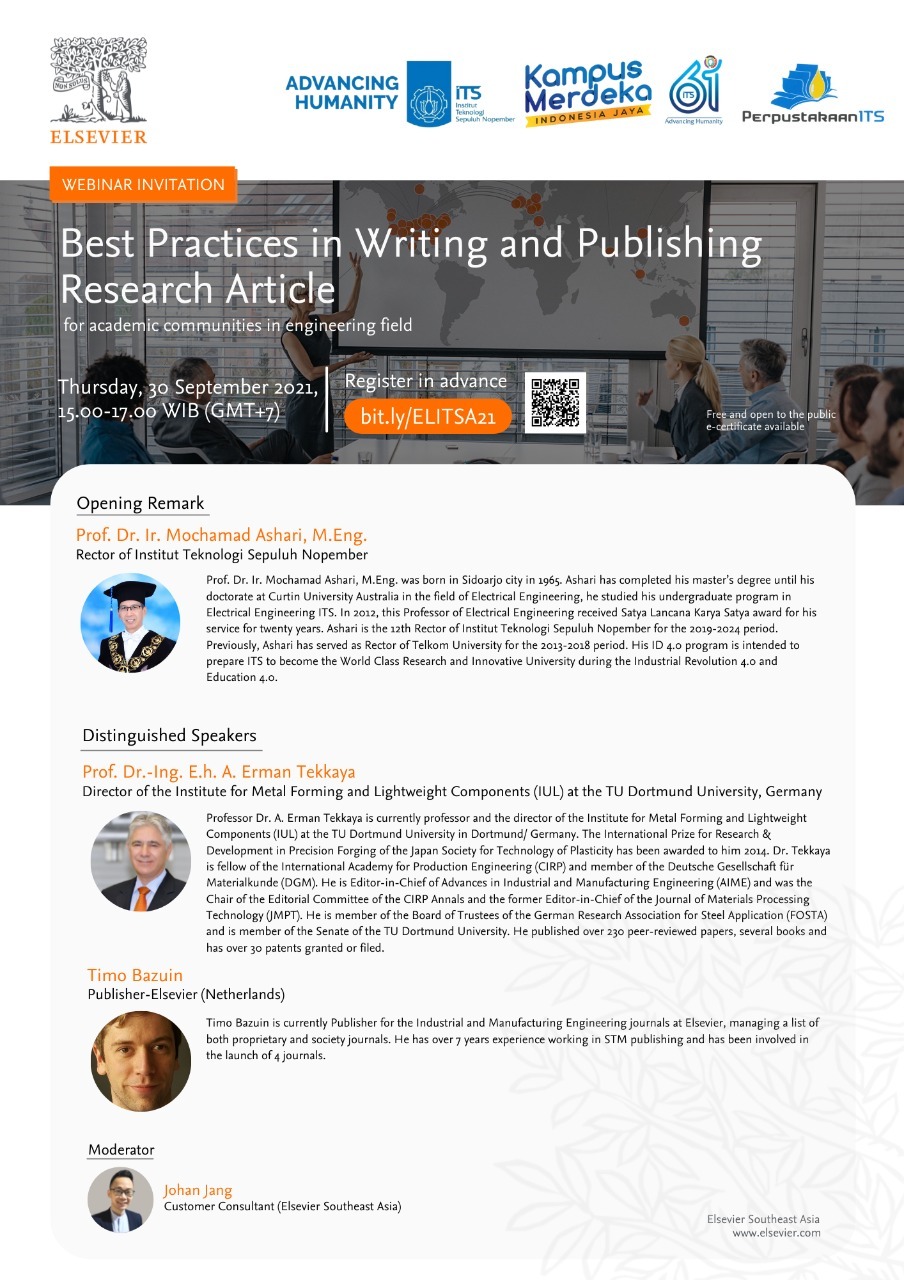 Best Practices in Writing and Publishing Research Article: for academic communities in engineering field merupakan webinar yang dibuat dengan kerjasama antara Elsevier dengan Institut Teknologi Sepuluh Nopember (ITS). Webinar ini akan diselenggarakan pada hari Jumat, 30 September 2021, 15.00-17.00 WIB.