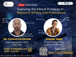 Narasumber: 🎙 Dr. Thomas Kaufmann (English Language Fellow, AWC-ITS) dengan topik “Ethical AI in Publication” 🎙 Johan Jang (Customer Consultant Elsevier Asia Pacific) dengan topik “Understanding Research Publication Ethics from Elsevier’s Perspectives”
