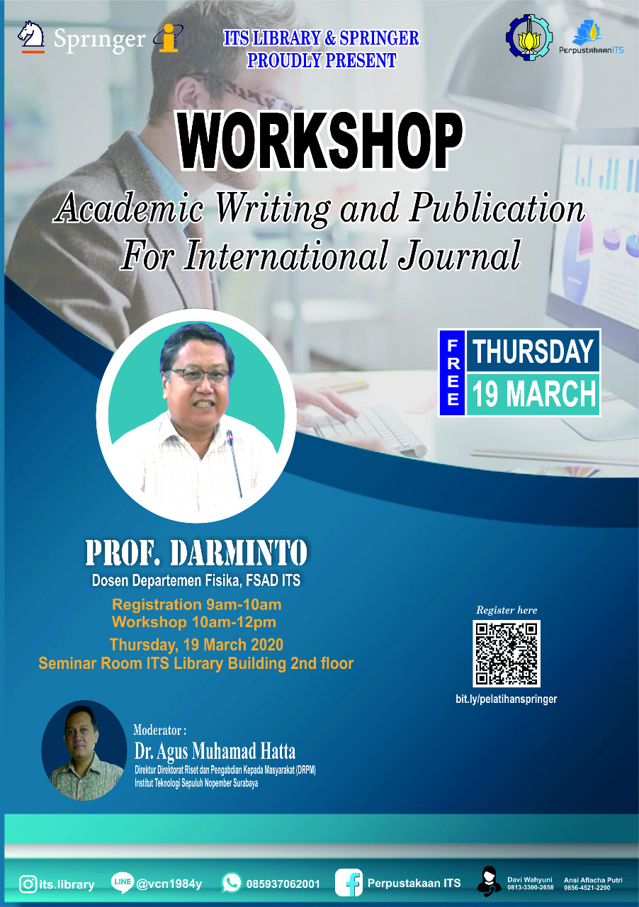Saat ini, publikasi karya ilmiah menjadi salah satu hal penting di lingkungan perguruan tinggi dikarenakan kewajiban bagi mahasiswa dan dosen untuk memiliki publikasi ilmiah. Melihat kenyataan akan pentingnya publikasi karya ilmiah di perguruan tinggi, maka Perpustakaan Institut Teknologi Sepuluh Nopember (ITS) bekerjasama dengan Penerbit Internasional Springer akan mengadakan Workhshop yang berjudul “Academic Writing and Publication for International Journal” untuk Registrasi klik disini
