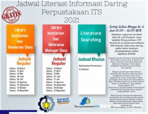 Program literasi informasi daring dijadwalkan secara rutin setiap bulan sebanyak 2 kali. Minggu kedua untuk E-Resources Class dan Minggu keempat untuk Reference Manager. Di setiap program literasi informasi (E-Resources Class dan Reference Manager) tersebut diawali dengan Library Instruction (disesuaikan dengan kebutuhan dan status sivitas akademika ITS saat mengikuti kelas). Jadwal pemberian program literasi informasi rutin setiap hari Selasa jam 10.00-12.00 WIB. Bila ingin mengikuti program literasi informasi daring yang sudah terjadwal di Perpustakaan ITS, silahkan registrasi terlebih dulu disini