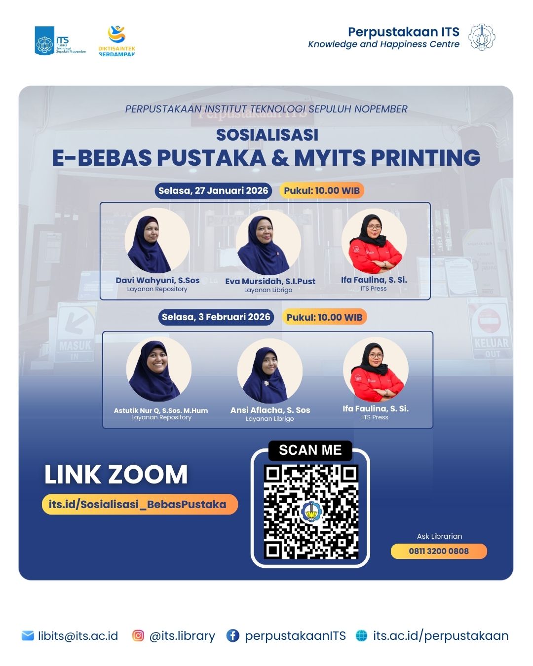 Pastikan Anda tidak melewatkan kegiatan ini. Ikuti secara online via Zoom: https://its.id/Sosialisasi_BebasPustaka Meeting ID : 929 1736 6292 Passcode : 747283