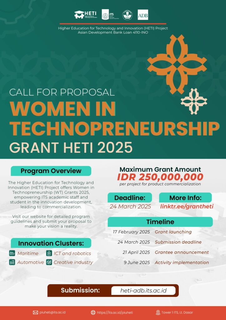 Higher Education for Technology and Innovation (HETI) Project, Asian Development Bank (ADB) is once again opening up opportunities for lecturers, students, and education staff (tendik) of the Institut Teknologi Sepuluh Nopember (ITS) to actively participate in the downstreaming of research and innovation at ITS through the Women in Technopreneurship Grant 2025.