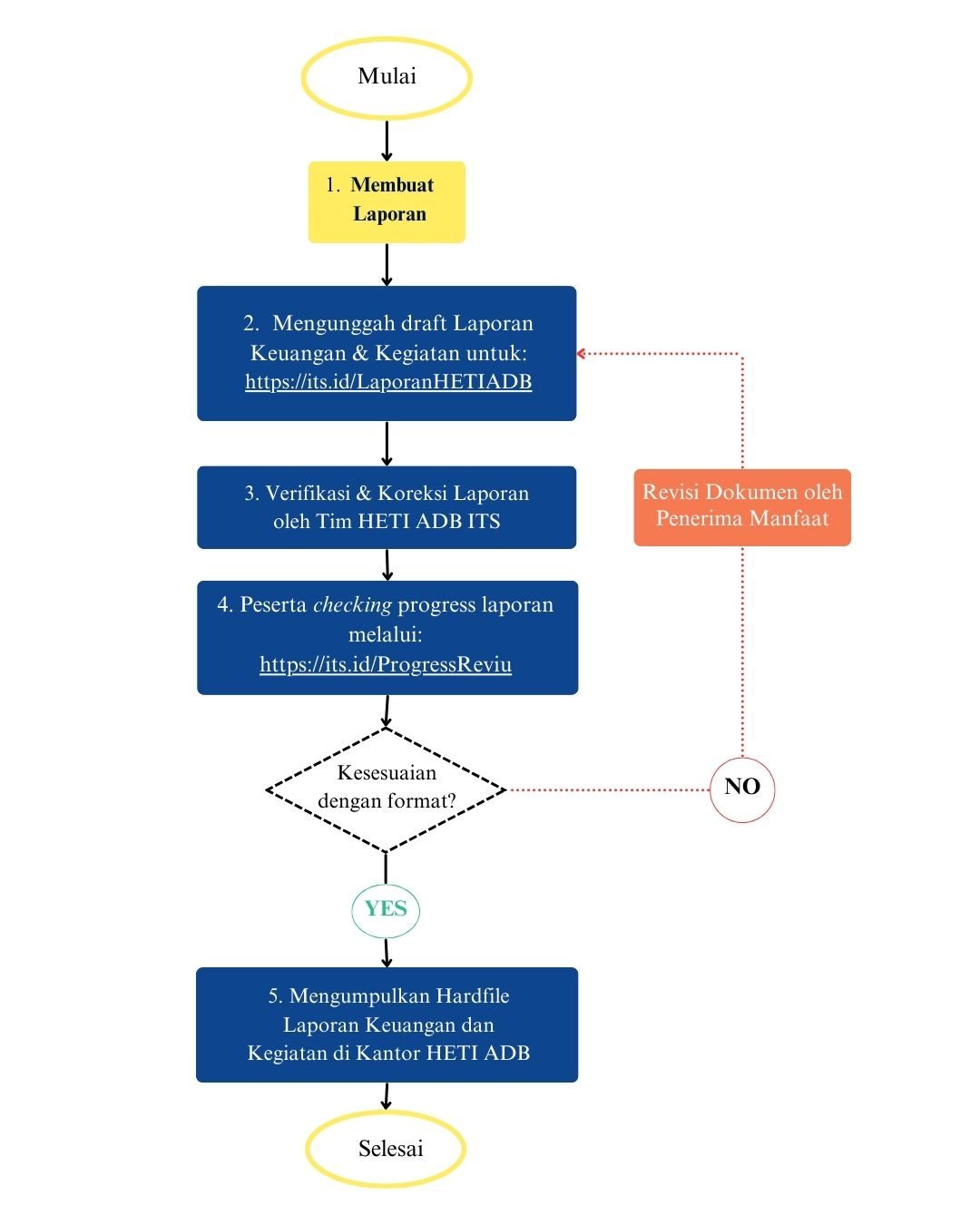 Tim HETI ITS melakukan review berkas laporan secara bertahap, yang mencakup validasi administratif, verifikasi kelengkapan output, dan kesesuaian anggaran. Proses ini akan diperbarui secara berkala melalui sistem pelaporan terpadu kami.