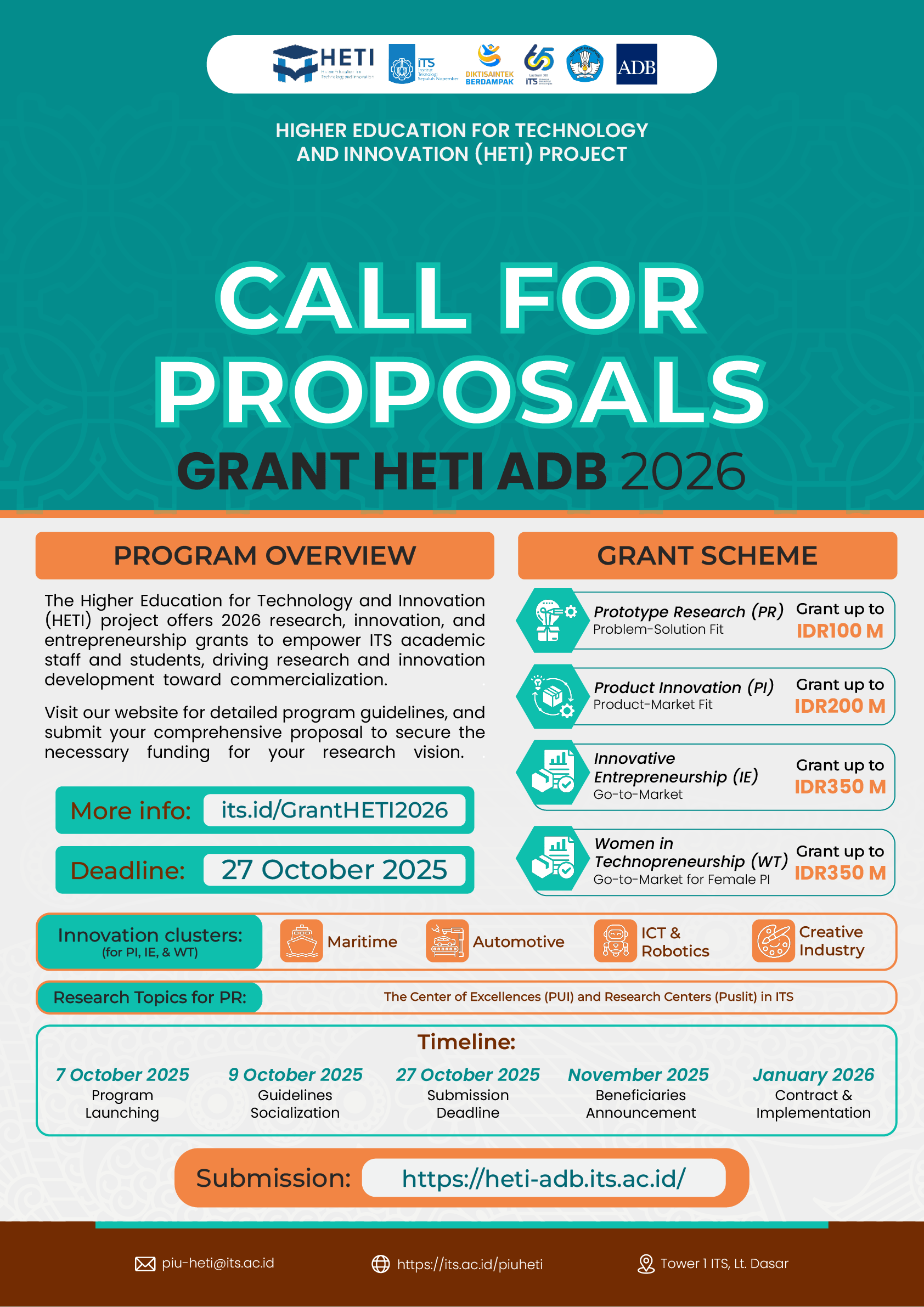 The proposal submission deadline has been extended until 31 October 2025. Submission can be done through myITS HETI Research , with the lead of proposal team being an active ITS lecturer.