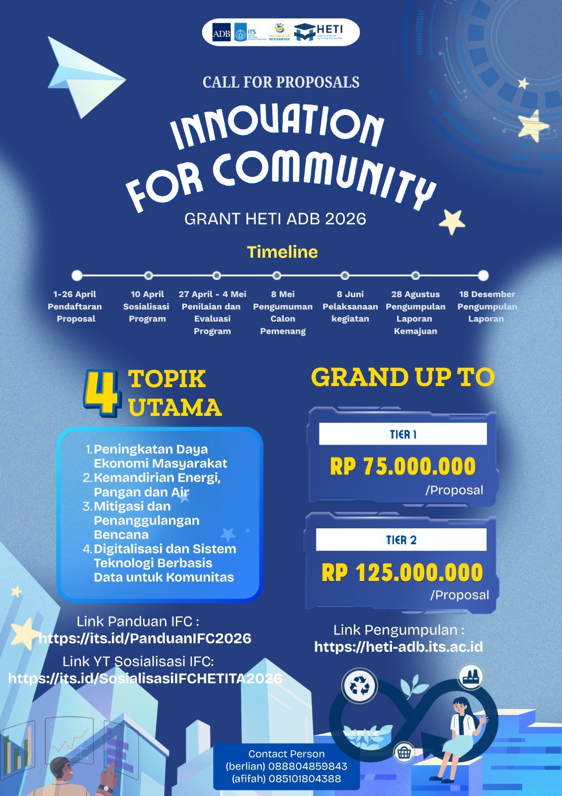 Kegiatan Grant of HETI Project ADB Loan No. 4110-INO ITS Tahun Anggaran 2026 telah membuka pendaftaran proposal untuk Skema Innovation for Community (IFC). Innovation for Community (IFC) merupakan skema baru dari Grant HETI-ADB yang difokuskan pada pengabdian masyarakat. Skema ini bertujuan menjembatani hasil riset dan inovasi ITS dengan kebutuhan nyata masyarakat melalui penerapan inovasi sains dan teknologi yang andal