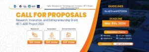 Higher Education for Technology and Innovation (HETI) Project, Asian Development Bank (ADB) membuka kesempatan bagi dosen, mahasiswa, dan tenaga kependidikan (tendik) Insitut Teknologi Sepuluh Nopember (ITS) untuk turut berperan aktif dalam proses hilirisasi riset dan inovasi di ITS melalui Kegiatan Research, Innovation, and Entrepreneurship Grant Tahun Anggaran 2024.