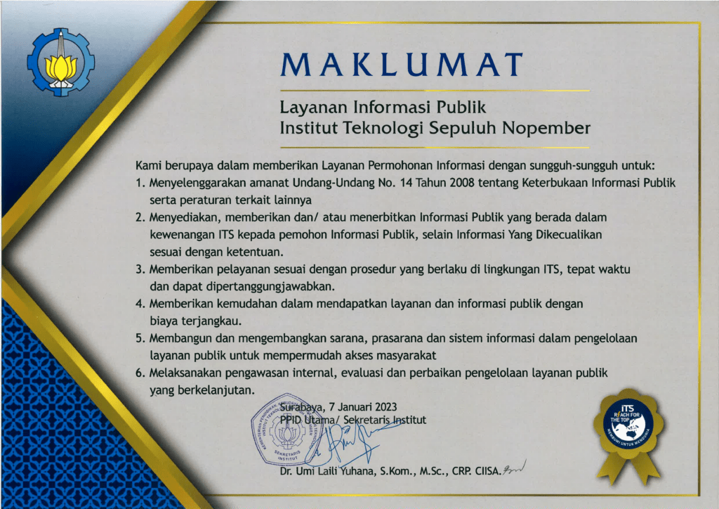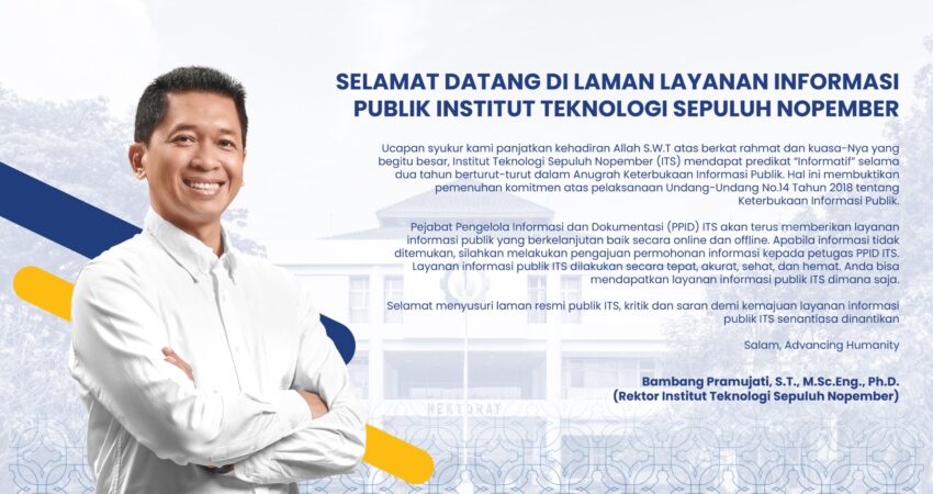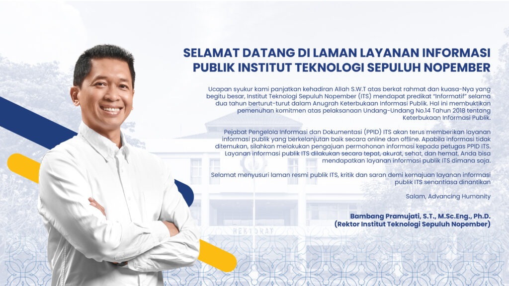 PPID ITS (Pejabat Pengelola Informasi dan Dokumentasi Institut Teknologi Sepuluh Nopember) adalah unit yang bertanggung jawab untuk memastikan transparansi dan akuntabilitas informasi publik di ITS. Dengan PPID ITS, Anda dapat meminta informasi terkait berbagai aspek institusi seperti program akademik, proyek penelitian, dan laporan keuangan. Selain itu, PPID ITS juga melayani pengajuan keluhan terkait layanan atau operasional ITS serta memberikan bantuan dalam memahami dan mengakses informasi publik.