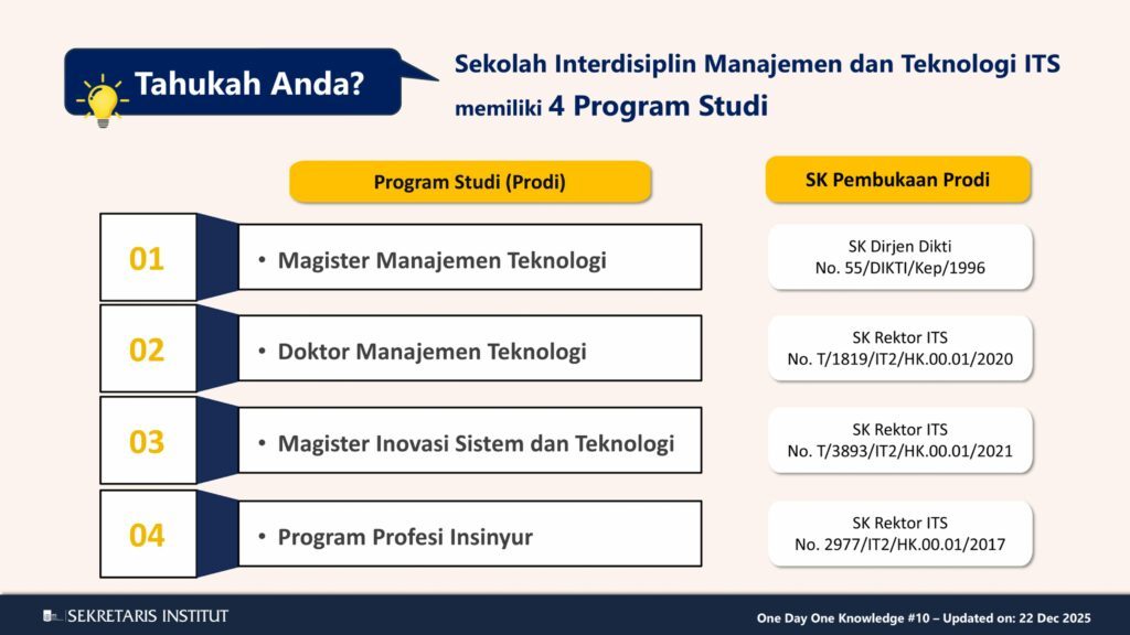 Berdasarkan SK Rektor ITS No. 611/IT2.T/HK.00.01/2023 Sekolah Interdisiplin Manajemen dan Teknologi ITS memiliki 4 Program Studi