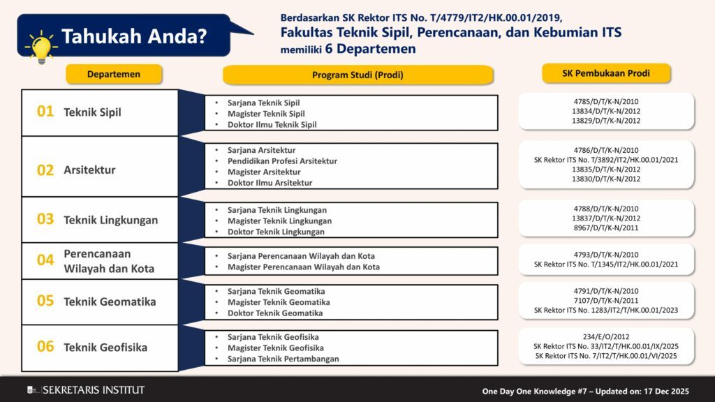 Berdasarkan SK Rektor ITS No. T/4779/IT2/HK.00.01/2019 Fakultas Teknik Sipil, Perencanaan, dan Kebumian ITS memiliki 6 Departemen