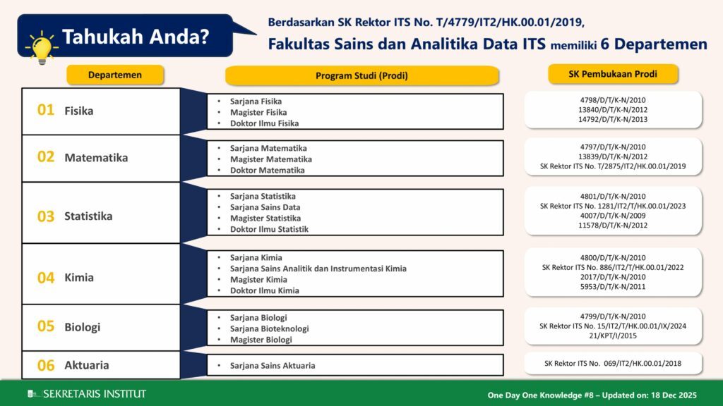 Berdasarkan SK Rektor ITS No. T/4779/IT2/HK.00.01/2019 Fakultas Sains dan Analitika Data ITS memiliki 6 Departemen