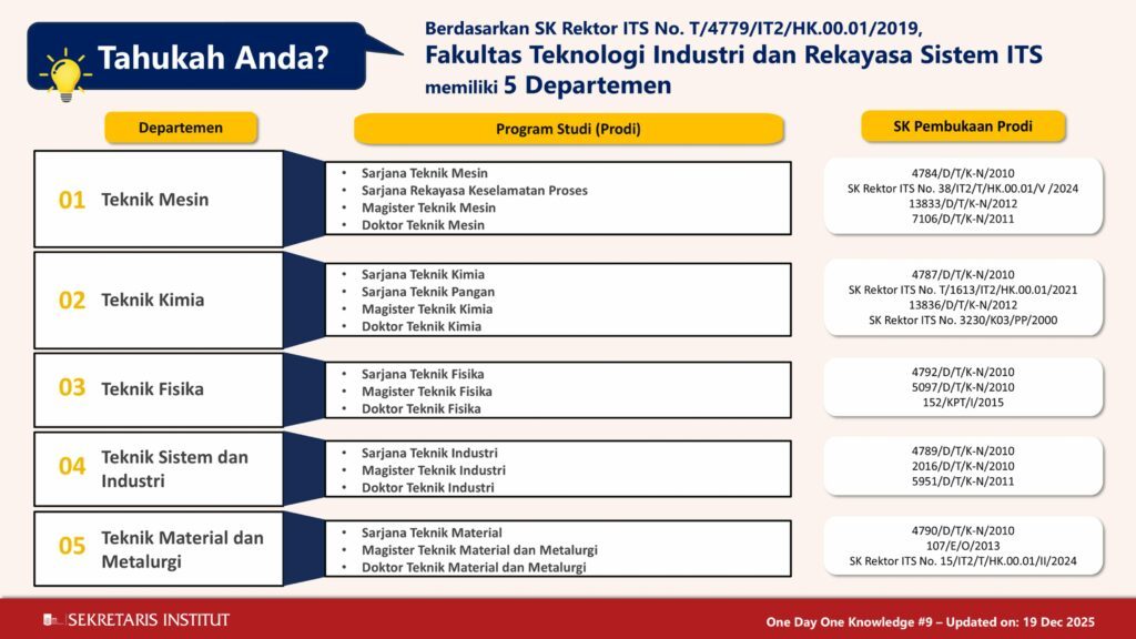 Berdasarkan SK Rektor No. T/4779/IT2/HK.00.01/2019 Fakultas Teknologi Industri dan Rekayasa Sistem ITS memiliki 6 Departemen