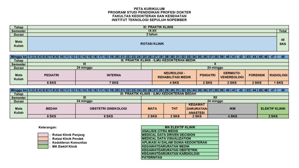 Kurikulum program studi pendidikan profesi dokter dirancang untuk memperdalam pengetahuan dan keterampilan klinis, mengasar kemampuan berpikir kritis, serta bertujuan untuk mempersiapkan lulusan dokter guna menghadapi tantangan praktik medis di dunia nyata secara mandiri. Berikut ini merupakan peta kurikulum dan daftar mata kuliah untuk program studi pendidikan profesi dokter ITS :
